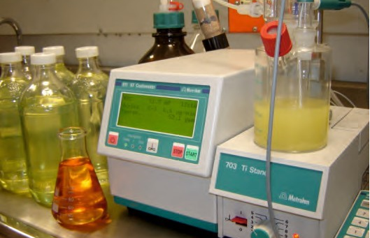 La prueba de contenido de humedad nos determina la cantidad de mg/kg de agua existente en el aceite, el método más utilizado para la realización de esta prueba es el Karl Fischer. El agua es uno de los enemigos principales del aceite por lo que es necesario mantener un nivel bajo de contenido de humedad en el mismo a fin de conservar bajas las características de perdida dieléctrica y minimizar la corrosión interna en el equipo. Un alto contenido de humedad puede conducir a una descarga eléctrica en el transformador, provocada por el deterioro de su sistema de aislamiento, principalmente por la descomposición de las fibras del papel aislante que es causada por la gran afinidad de este elemento con el agua.
